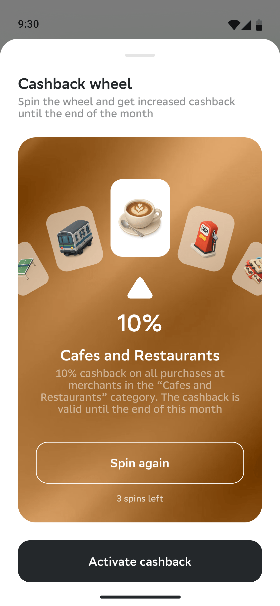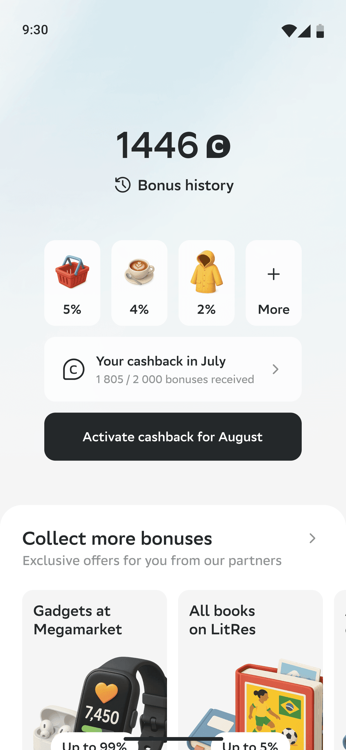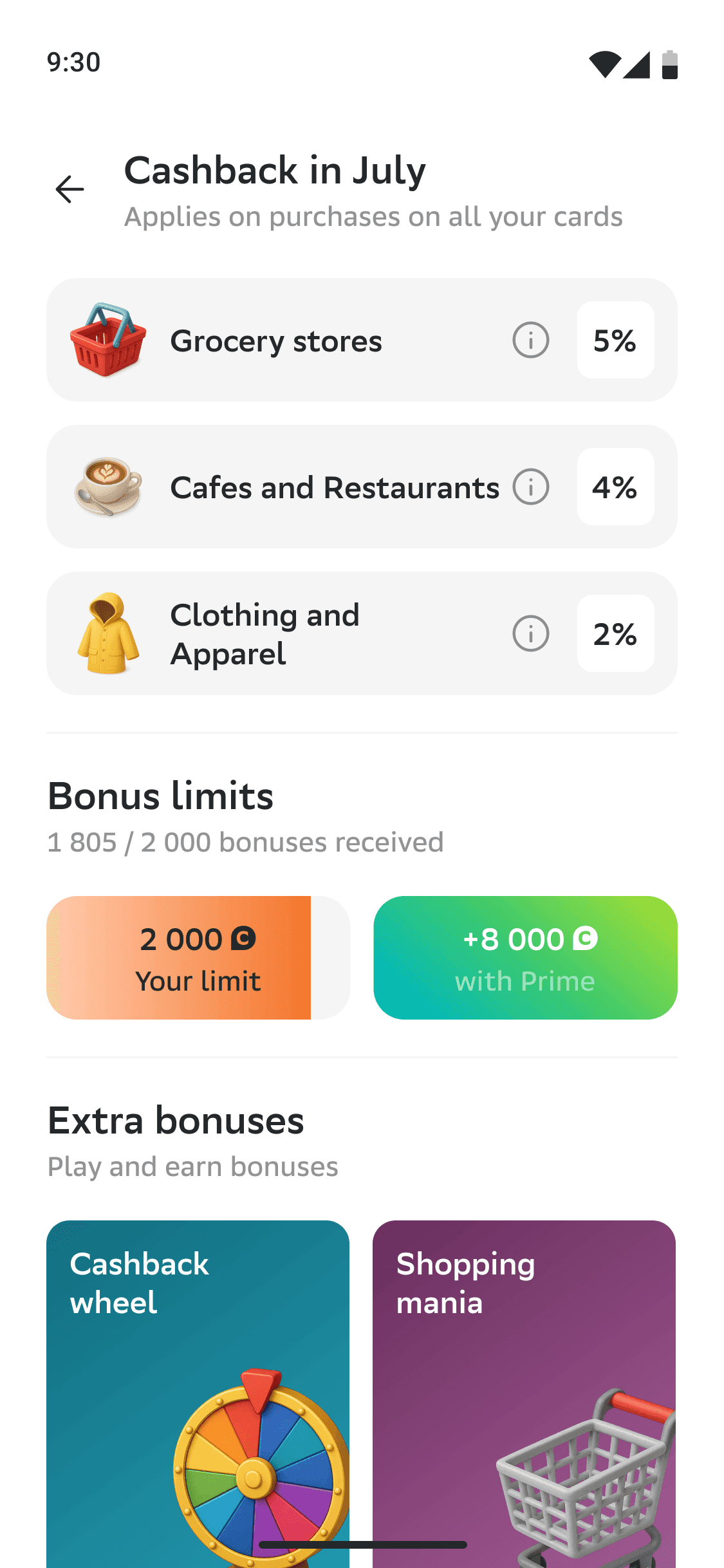 On the active categories detail page, we display the bonus points limit. Users without a subscription have a limit of 2,000 bonus points, while SberPrime subscribers have their limit increased to 10,000 bonus points, along with the option to activate a promo cashback once a month