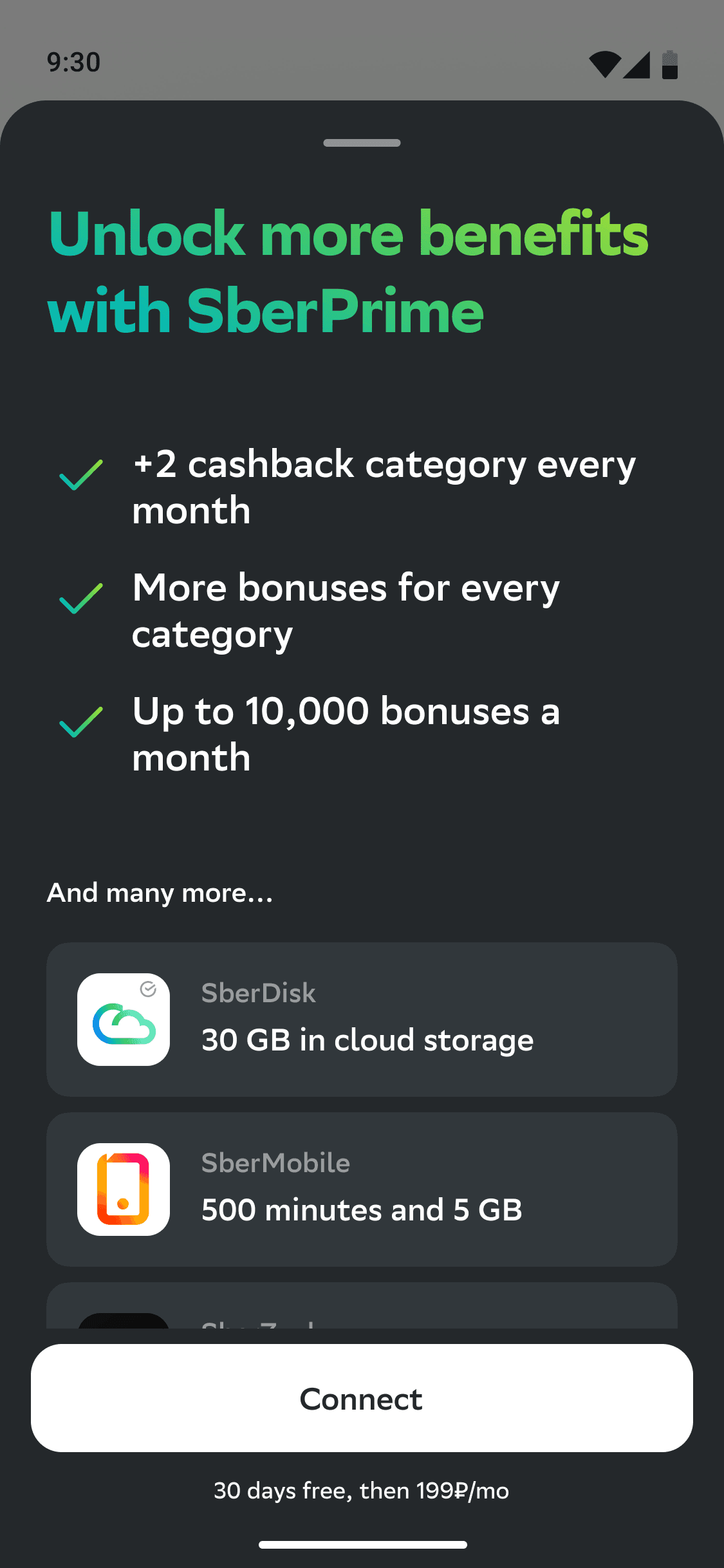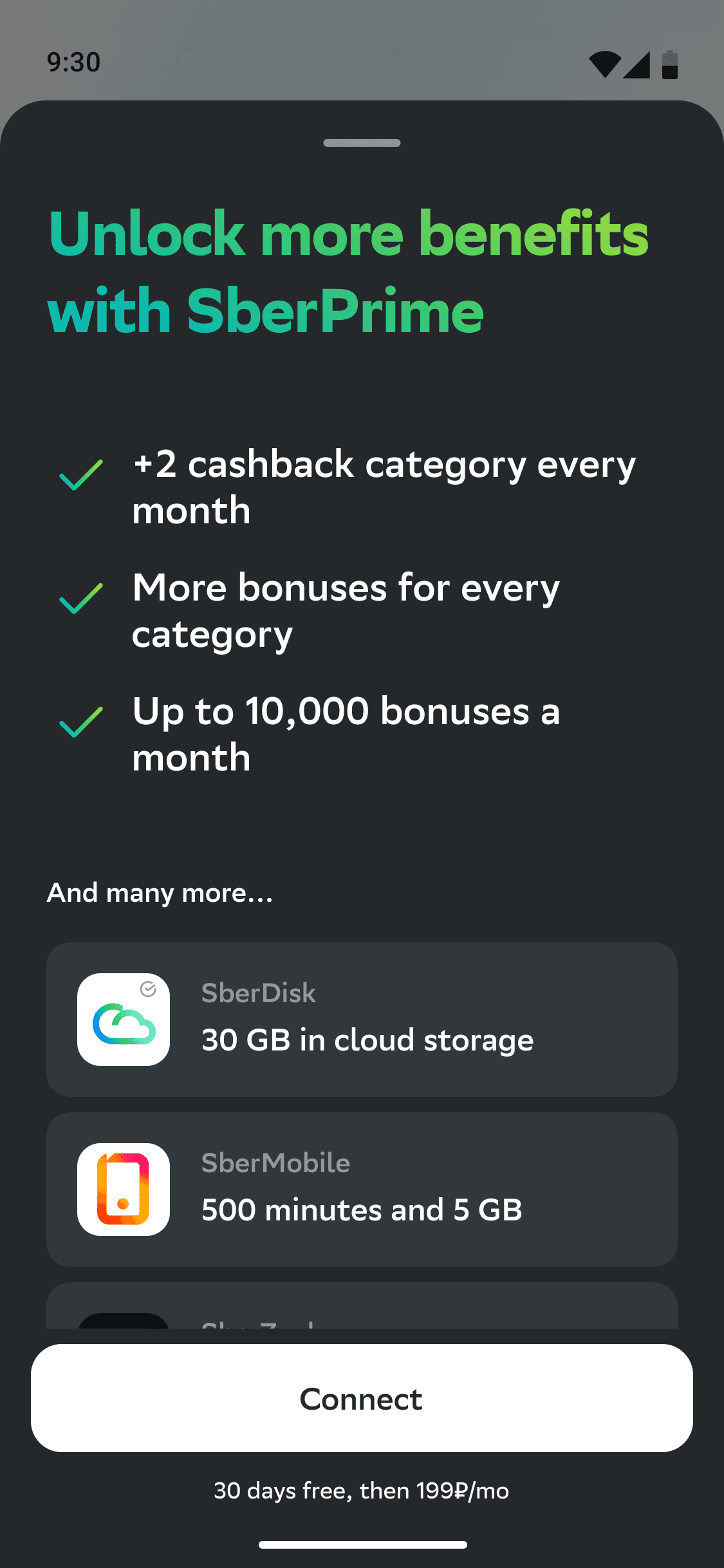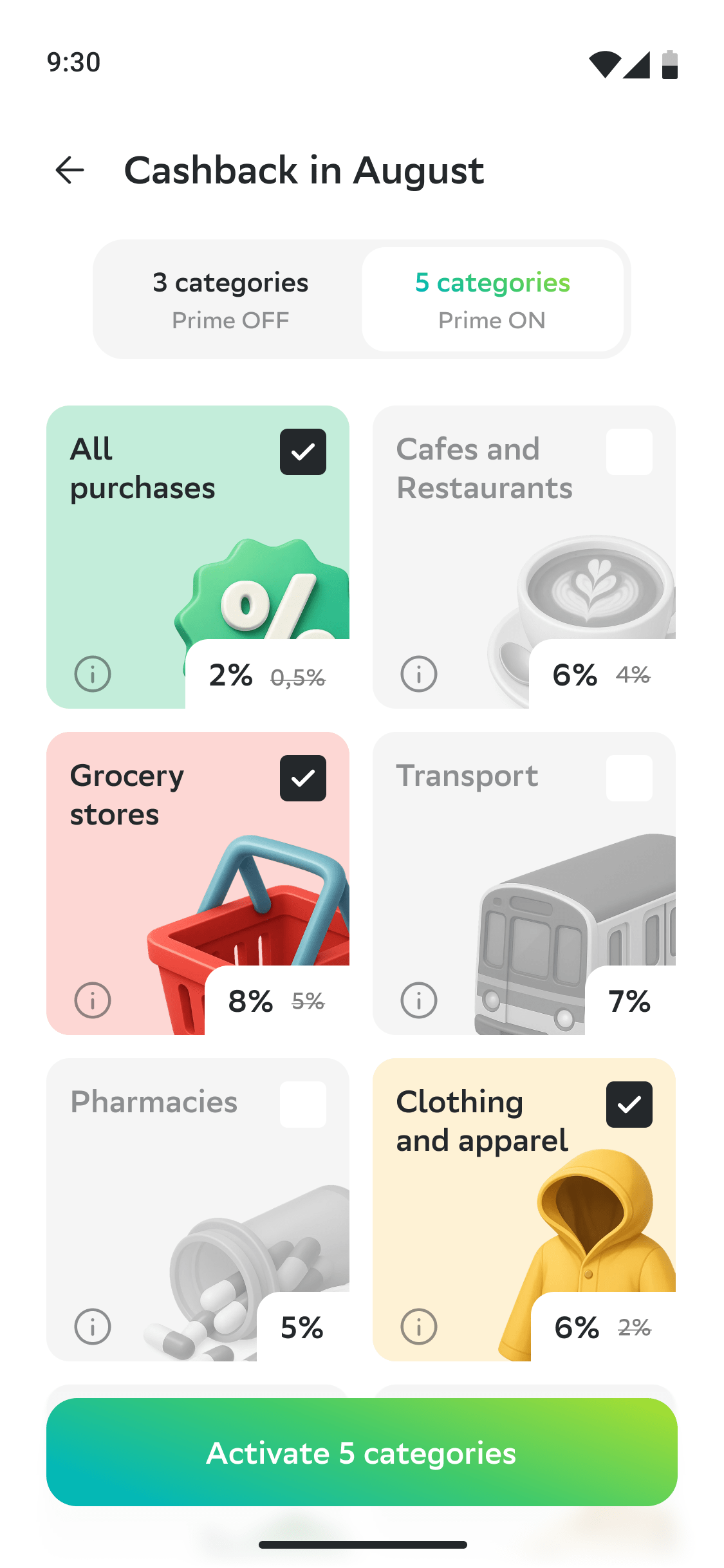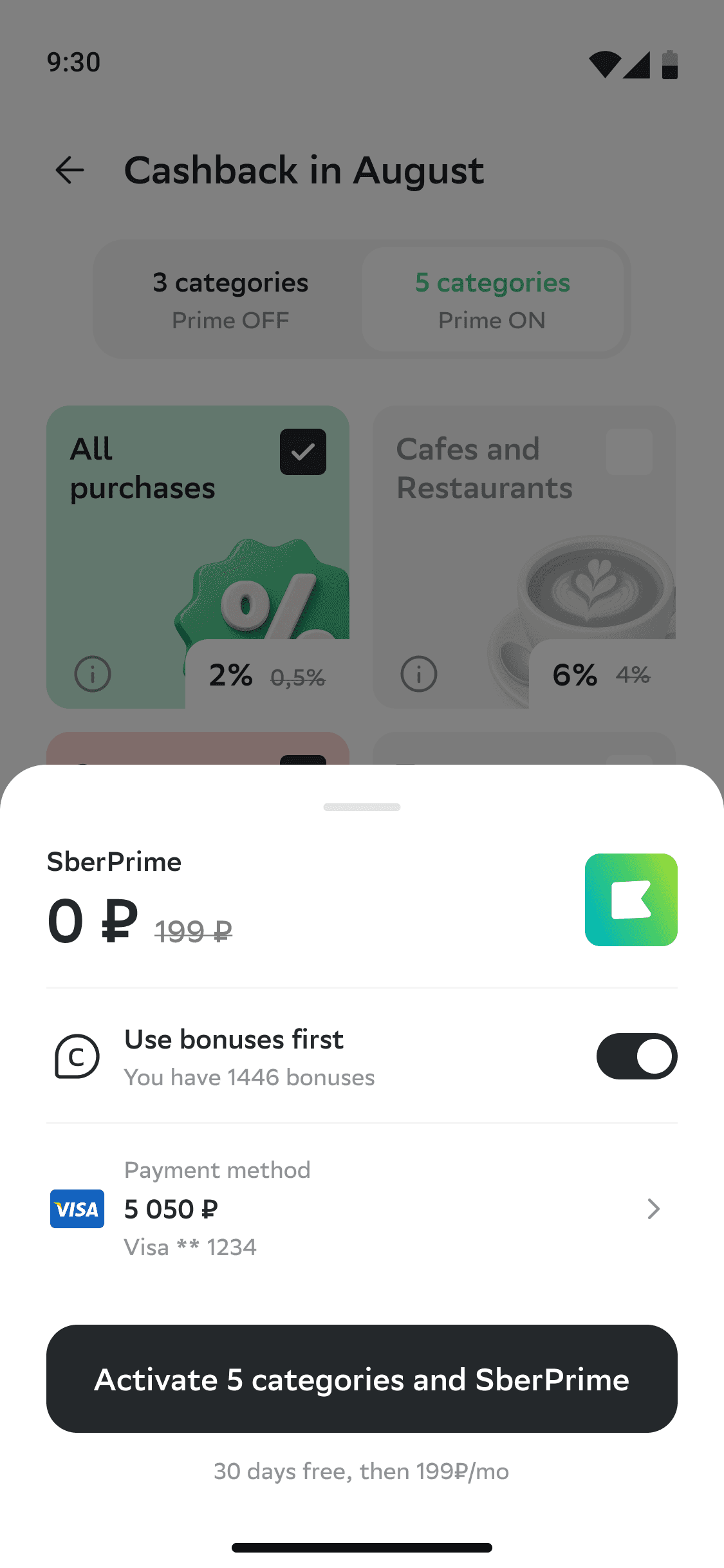 On the active categories page, we display the cashback options available to the user. By switching to the SberPrime tab, users are offered additional categories with increased cashback. Selecting these initiates the subscription and category activation process.
